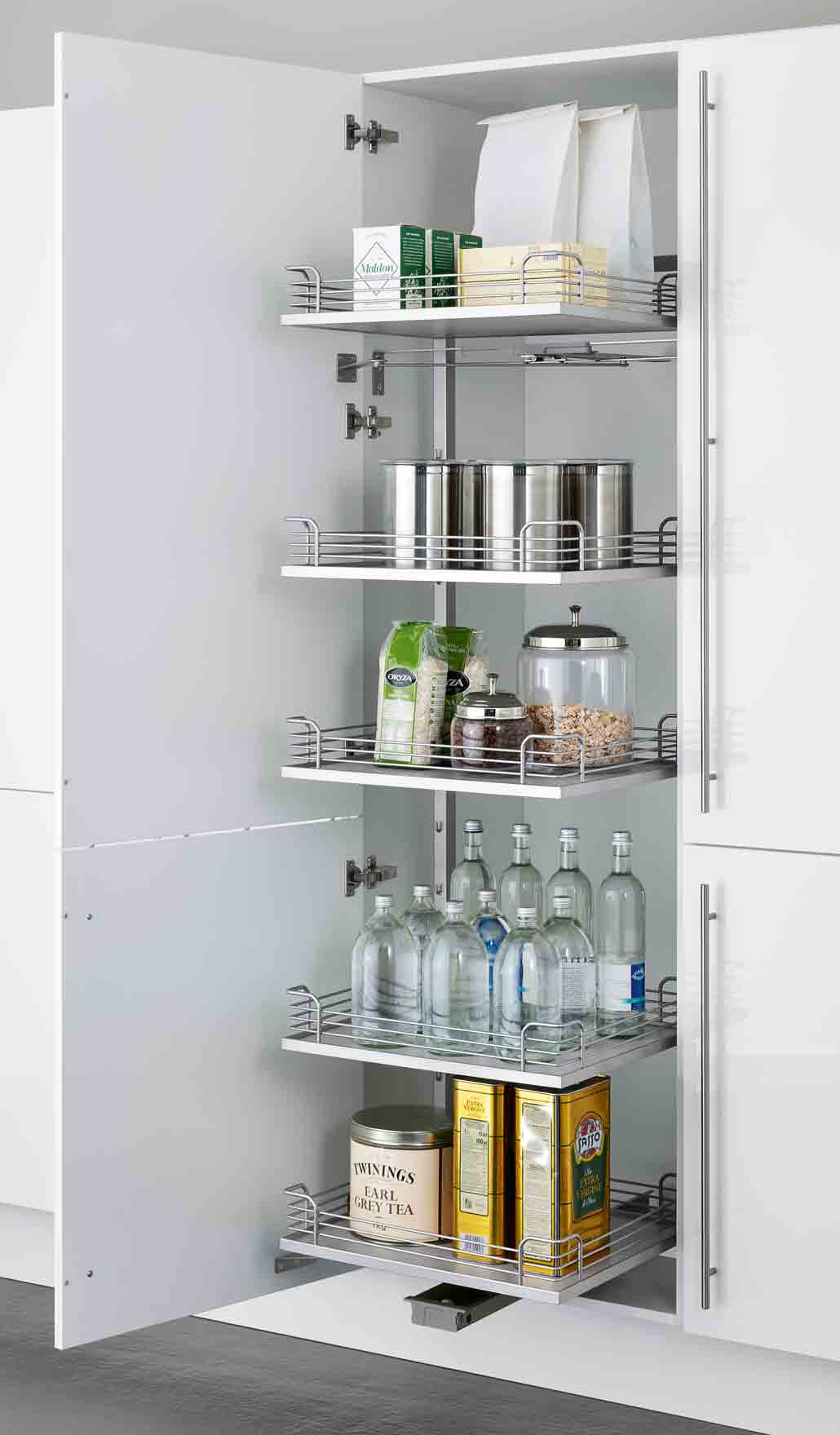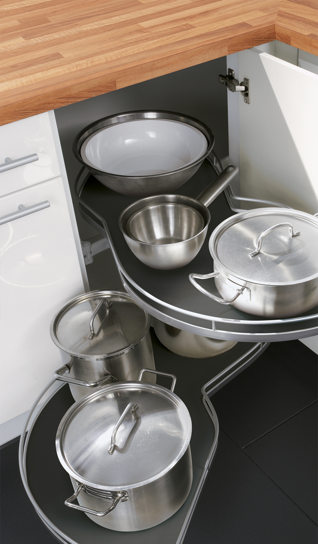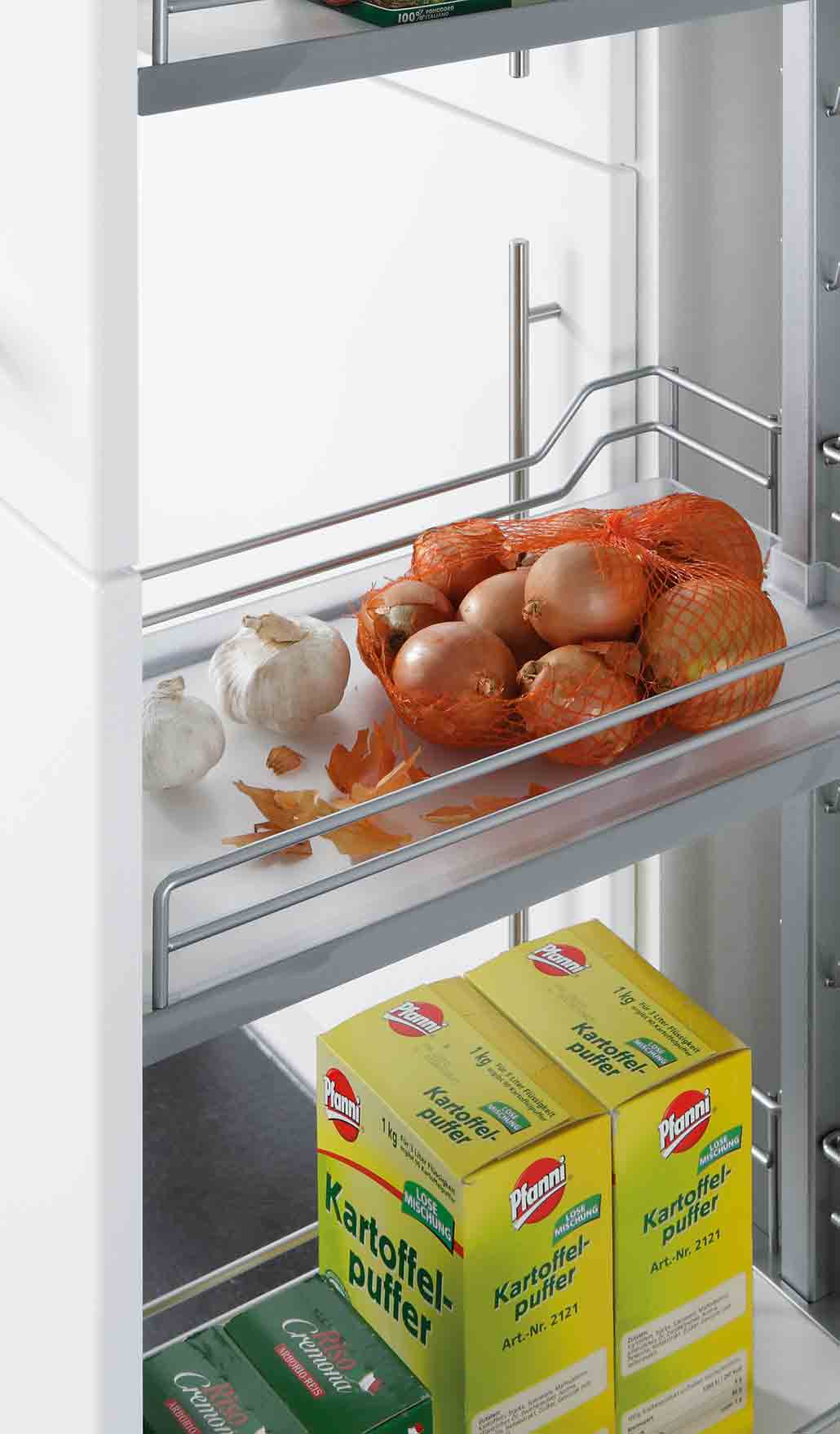 Die schwenkbaren Auszüge kommen Ihnen bei der Suche nach den richtigen Schüsseln und Töpfen sprichwörtlich entgegen und sind die ideale Ausstattung für Eckschränke.